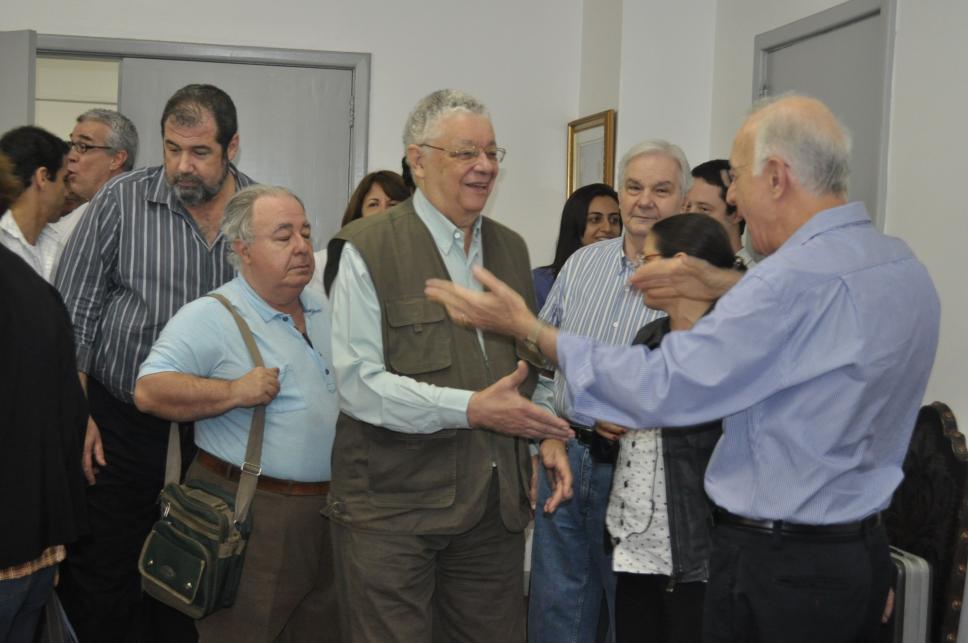O prof. César Romero é cumprimentado pelos presentes por sua posse como diretor do Departamento de Comunicação Social.