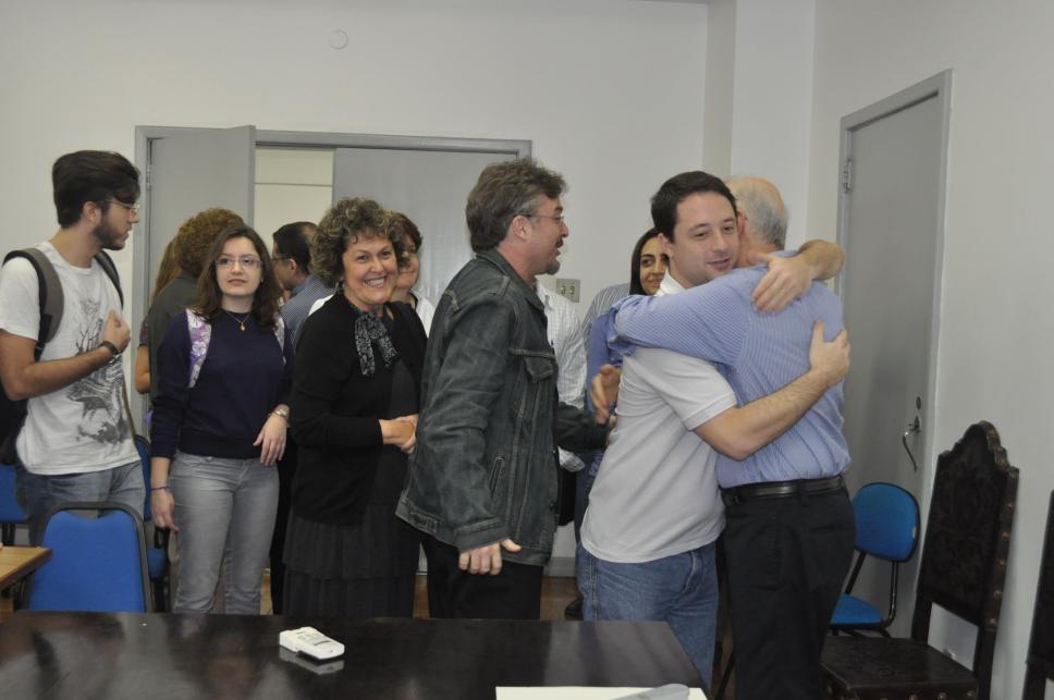 O prof. César Romero é cumprimentado pelos presentes por sua posse como diretor do Departamento de Comunicação Social.