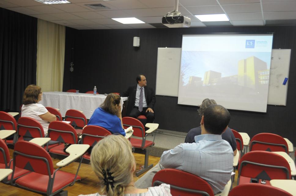 O Dr. Luiz Fabio Mesquiati, representante do Institute of Education, ministra palestra informativa sobre o convênio de cooperação internacional firmado pelo Departamento de Educação entre a PUC-Rio e The University of London.