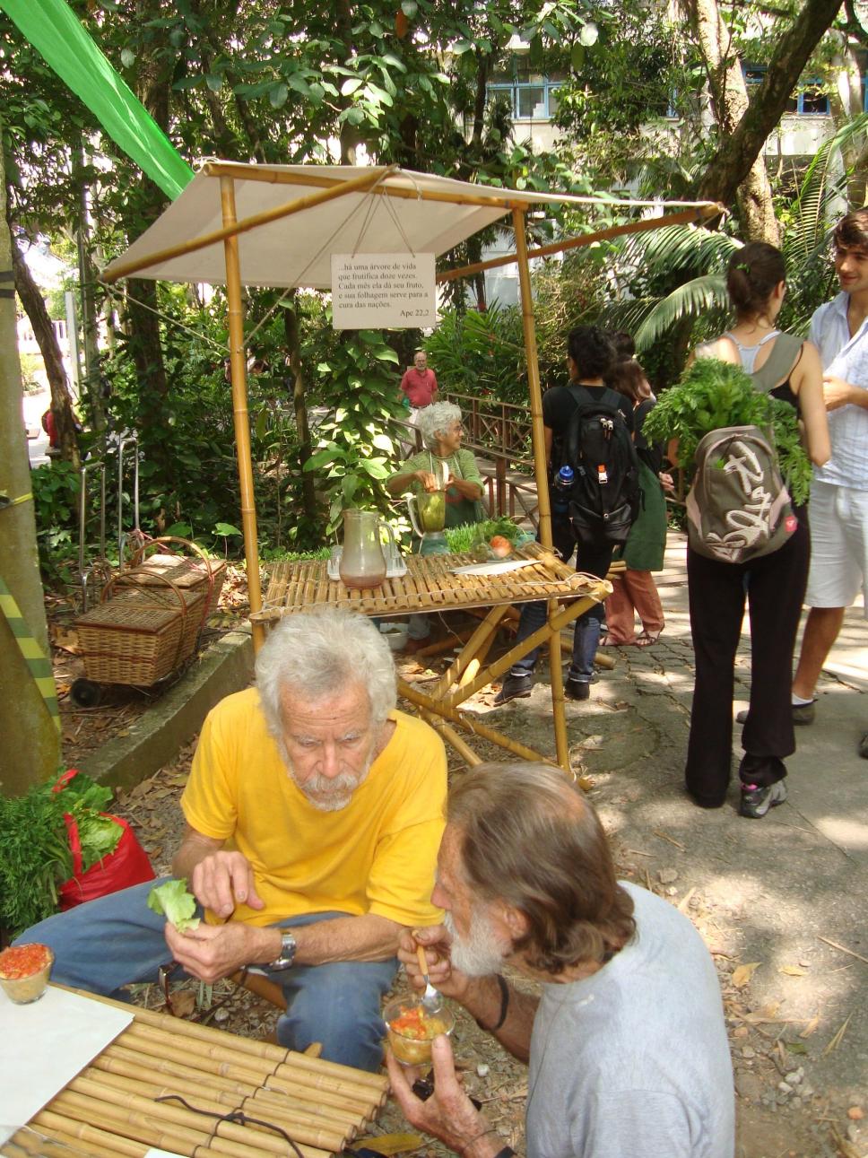 O decorrer da Feira. Participantes degustam os produtos oferecidos enquanto alunos conversam.