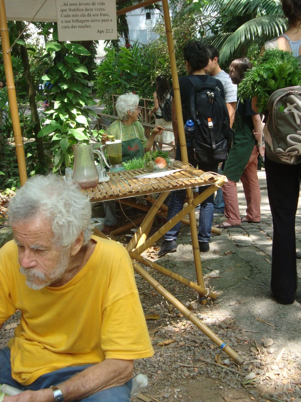 O decorrer da Feira. Participantes degustam os produtos oferecidos enquanto alunos conversam.