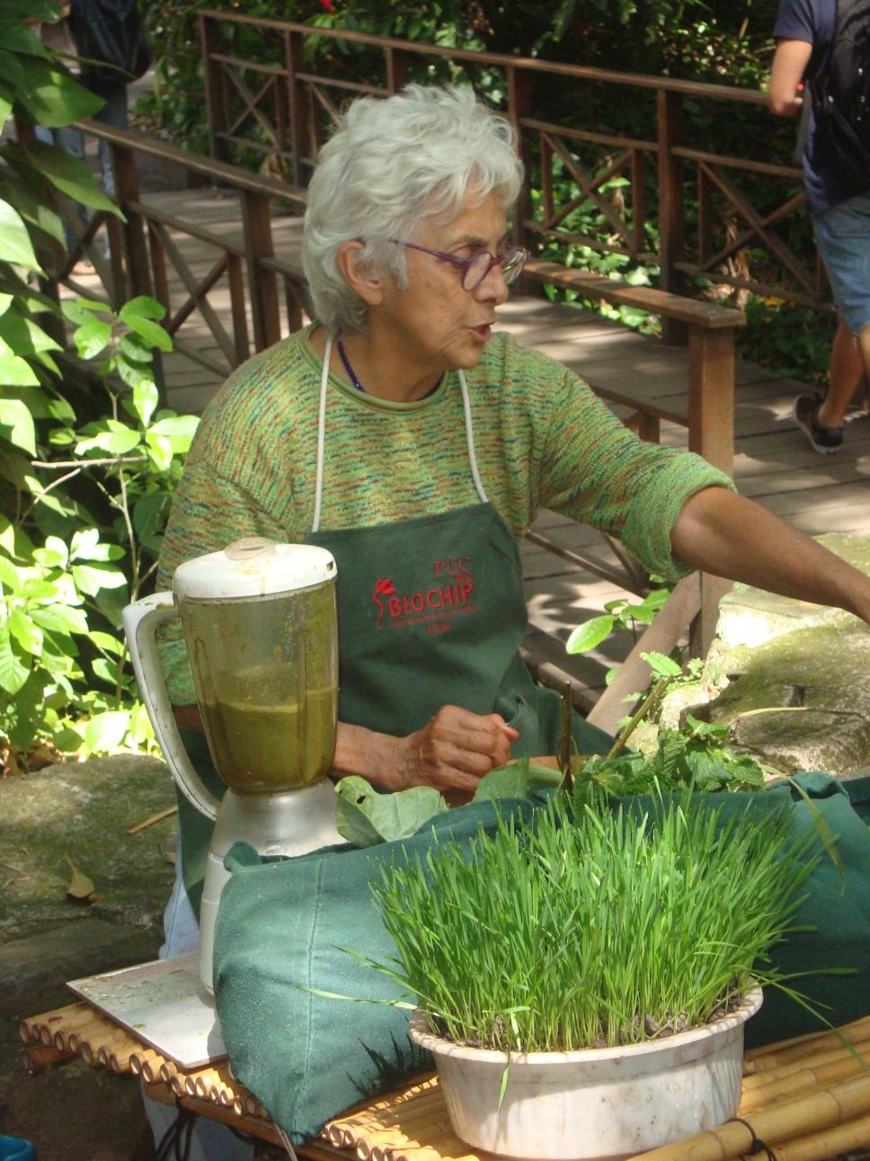 O decorrer da Feira. A profa. Ana Branco prepara o Suco de Luz em sua barraca.