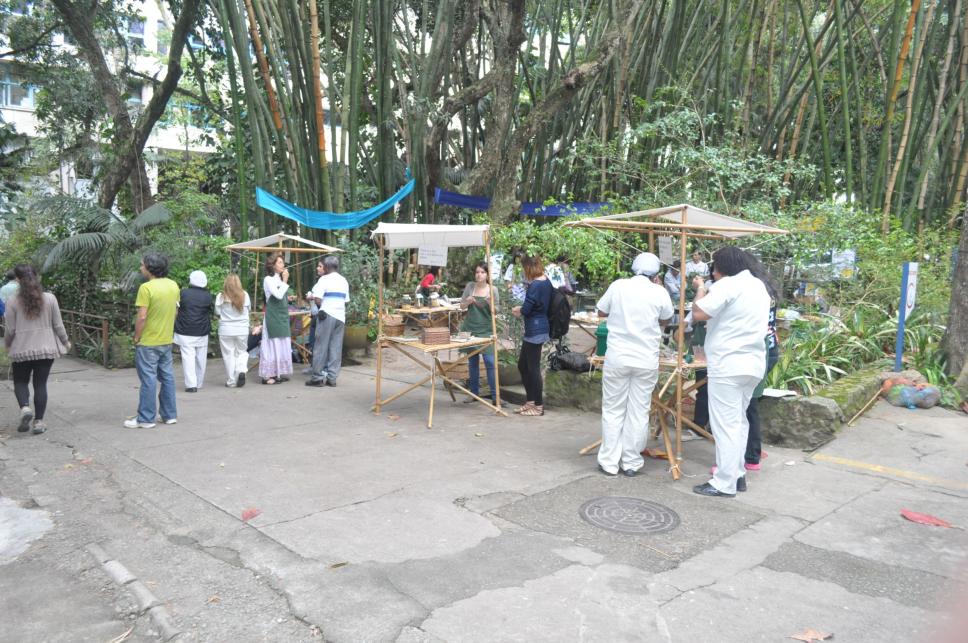 O decorrer da Feira. Funcionários de empresa terceirizada da PUC-Rio e pessoas de fora da PUC-Rio visitam a feira.