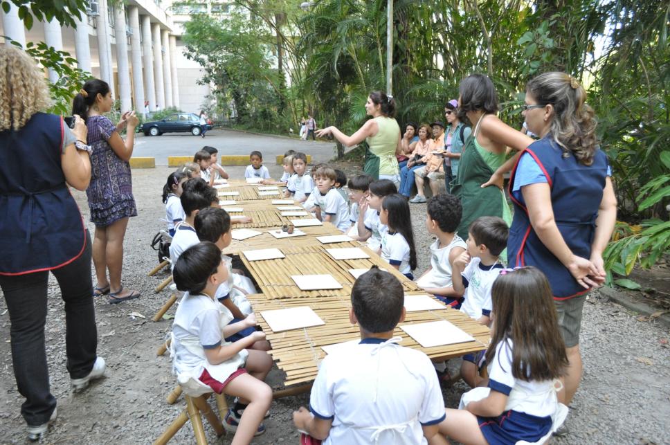 Crianças de escola particular participam de atividade desenvolvida na Feira de Desenho Vivo. Aprendem a fazer massinha de modelar comestível.