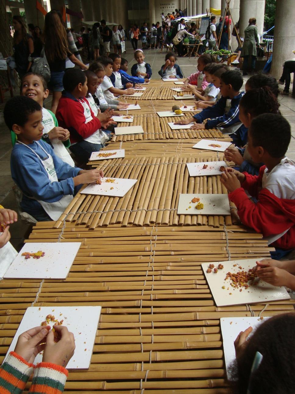 Crianças de escola municipal participam de atividade desenvolvida na Feira de Desenho Vivo. Aprendem a fazer massinha de modelar comestível.