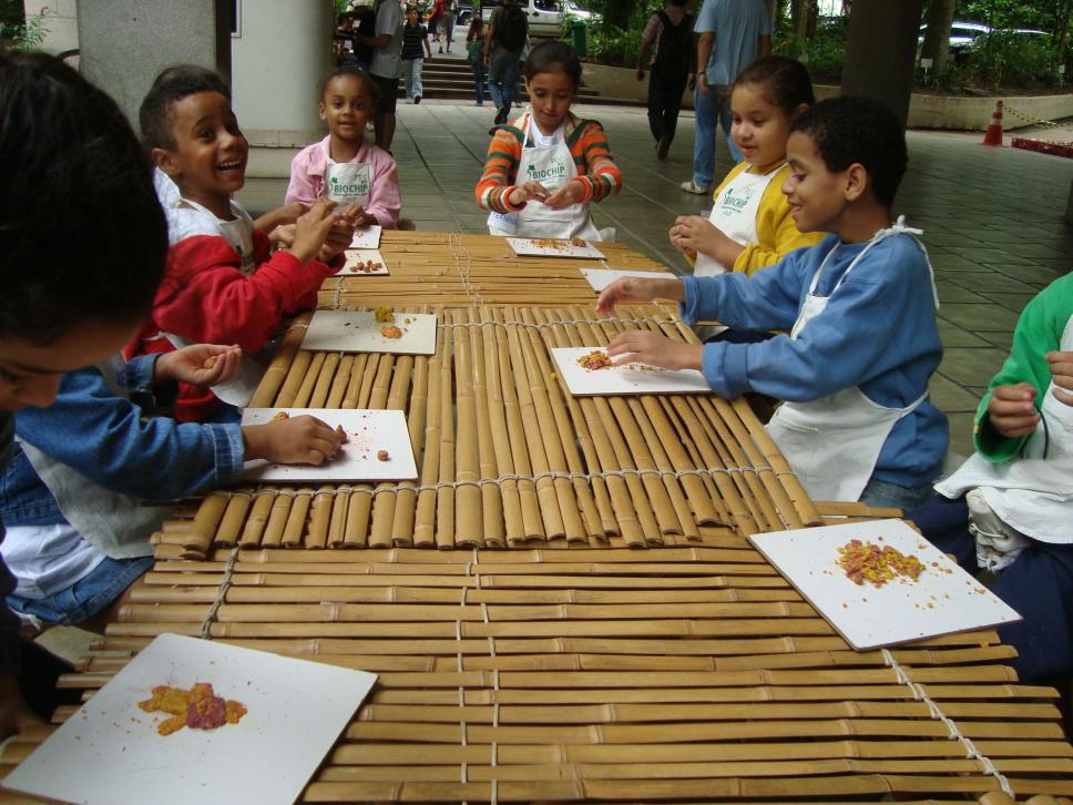 Crianças de escola municipal participam de atividade desenvolvida na Feira de Desenho Vivo. Aprendem a fazer massinha de modelar comestível.