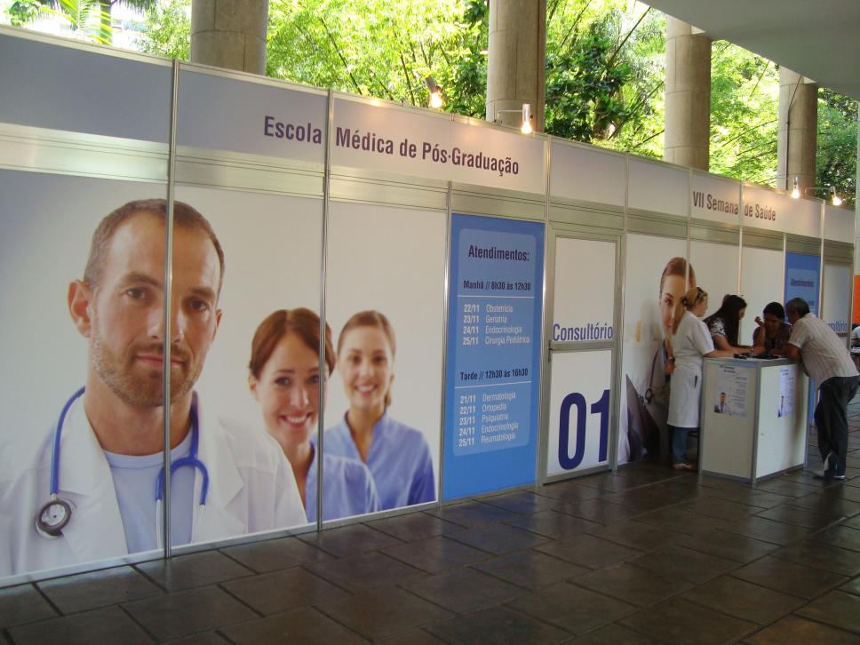 Imagem do estande da VII Semana de Saúde, promovida pela Escola Médica de Pós-Graduação, no pilotis do Edifício Kennedy.
