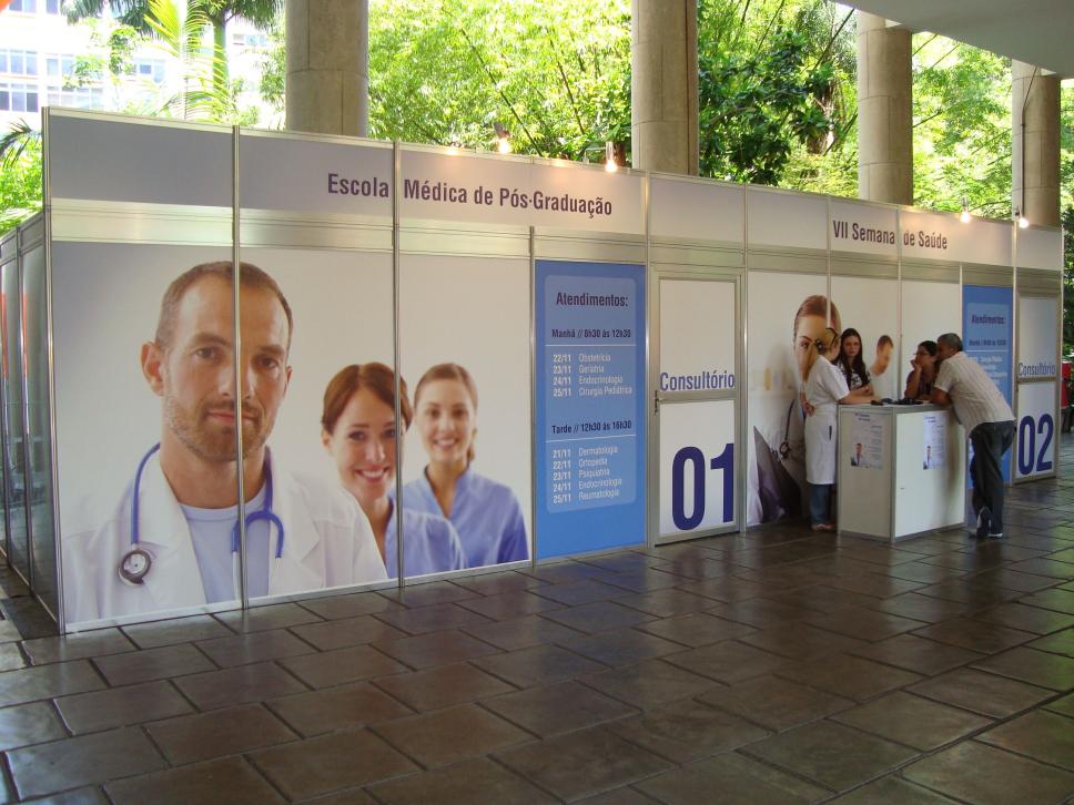 Imagem do estande da VII Semana de Saúde, promovida pela Escola Médica de Pós-Graduação, no pilotis do Edifício Kennedy.