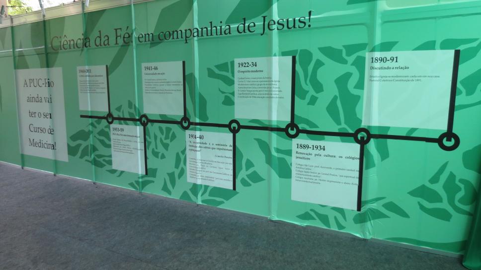 Painel de divulgação dos projetos do Centro de Ciências Biológicas e de Medicina da PUC-Rio, como a consolidação da graduação em Ciências Biológicas e o projeto de criação de uma graduação em Medicina.