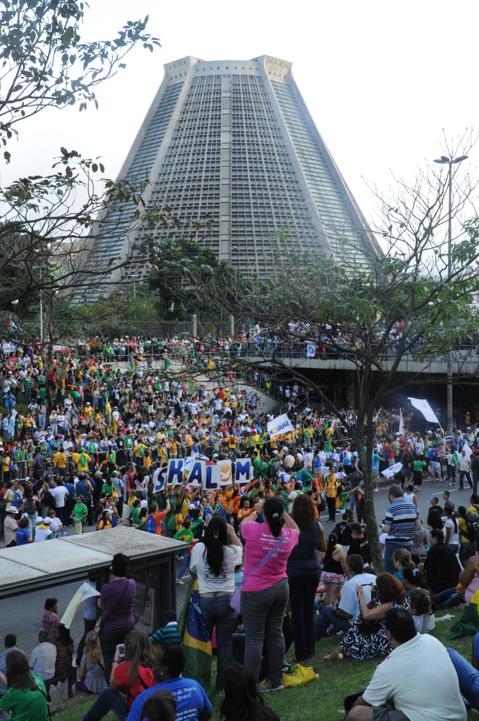 Público nas ruas do Centro do Rio de Janeiro aguarda a chegada do Papa Francisco.