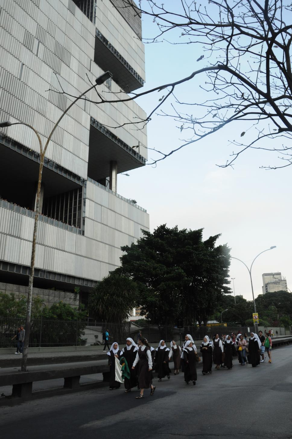 Freiras caminham nas ruas no Centro do Rio de Janeiro para acompanhar a chegada do Papa Francisco.