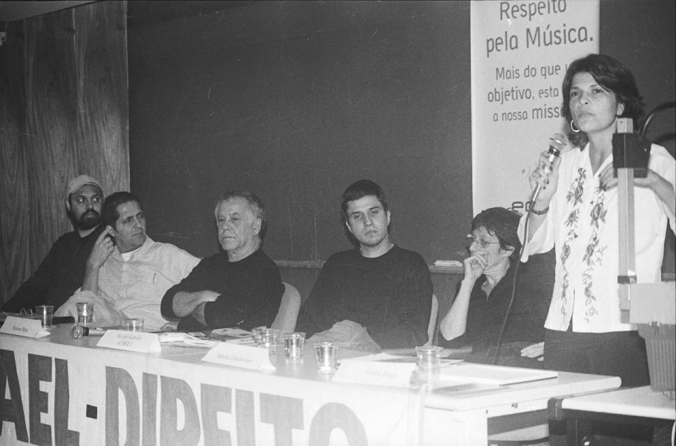 Da esq. para direita: Marcelo Yuka (ex-baterista da banda O Rappa), n.i., Nelson Motta (jornalista), Hélder José Galvão e Silva (CAEL), profa. Marisa Gandelman (JUR), Glória Braga (ECAD)