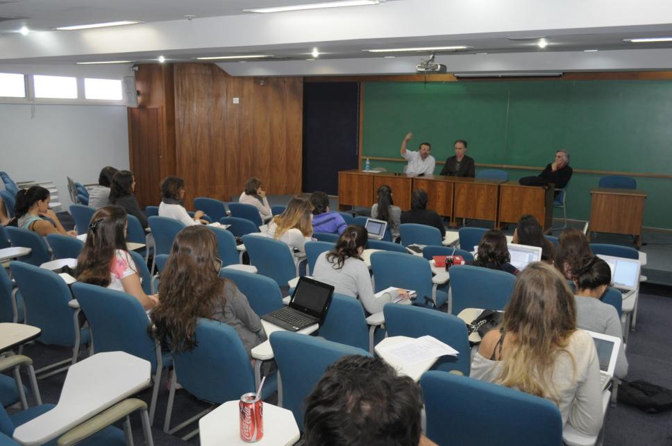 Na mesa, da esquerda para direita: prof. Adriano Pilatti (JUR), o cineasta Roberto Mader e o prof. José Maria Gomez (JUR)