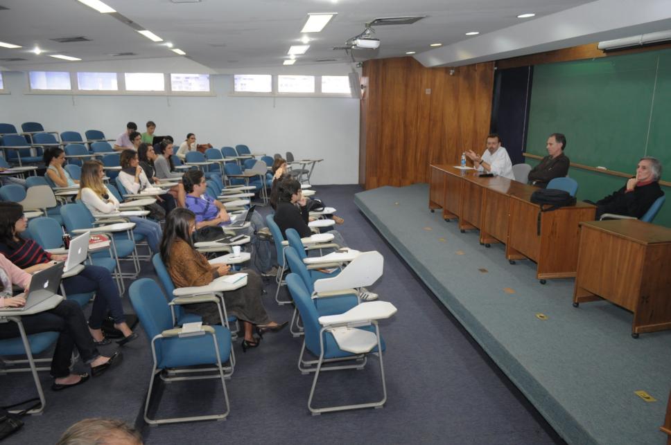 Na mesa, da esquerda para direita: prof. Adriano Pilatti (JUR), o cineasta Roberto Mader e o prof. José Maria Gomez (JUR)