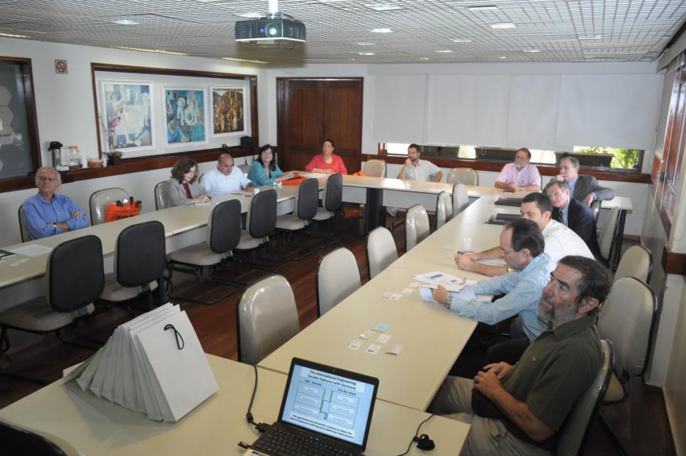 1o. à dir.: prof. Fred Palmeira (Carlos Frederico Borges Palmeira) (MAT); 1º à esq.: prof. Nélio Domingues Pizzolato (IND); No fundo ao centro: prof. Sidnei Paciornik (DEMA)