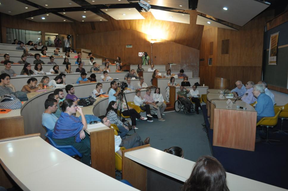 Na mesa o prof. Cesar Romero (COM), o prof. Miguel Pereira (COM) e os cineastas Carlos Manga e Roberto Farias.