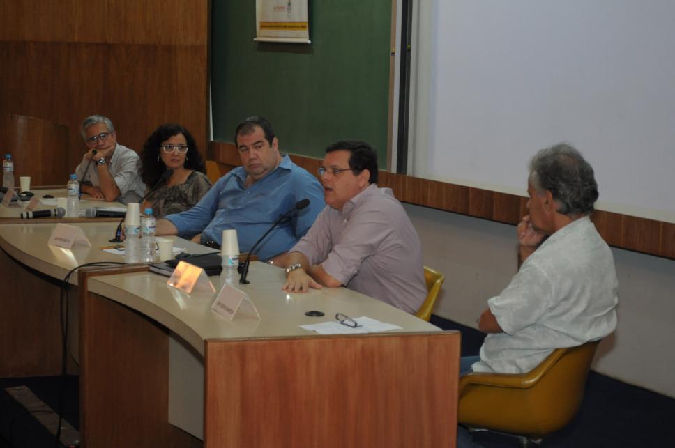 Da esquerda para direita: João Luiz Vieira, Ilda Santiago (cineastas), prof. Arturo Netto (COM), Luiz Henrique Severiano Ribeiro Baez (curador do acervo dos Estúdios Atlântida) e prof. Ney Costa Santos (COM)