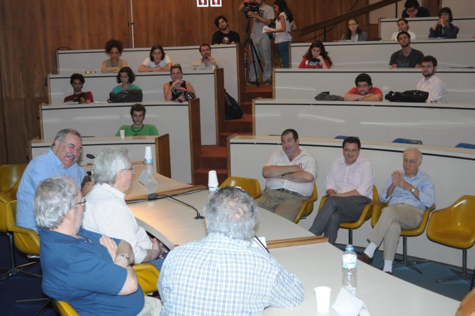 Na primeira fileira, de braços cruzados, prof. Arturo Netto (COM), ao lado dele, Luiz Henrique Severiano Ribeiro Baez e o prof. Cesar Romero Jacob (COM); na mesa: Luiz Carlos Barreto (cineasta), Roberto Faria (cineasta), prof. Miguel Serpa Pereira (COM)