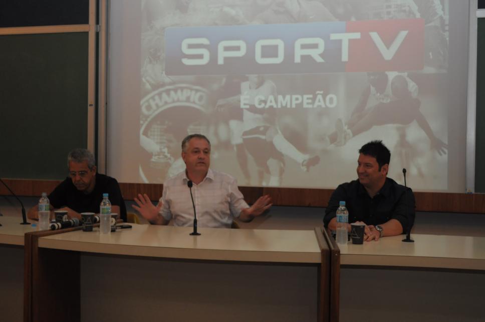 Da esq, pra direita: prof. Ernesto Rodrigues (COM), Raul Costa Jr. (Diretor de Conteúdo do canal SporTV) e Luiz Carlos Jr. (narrador)