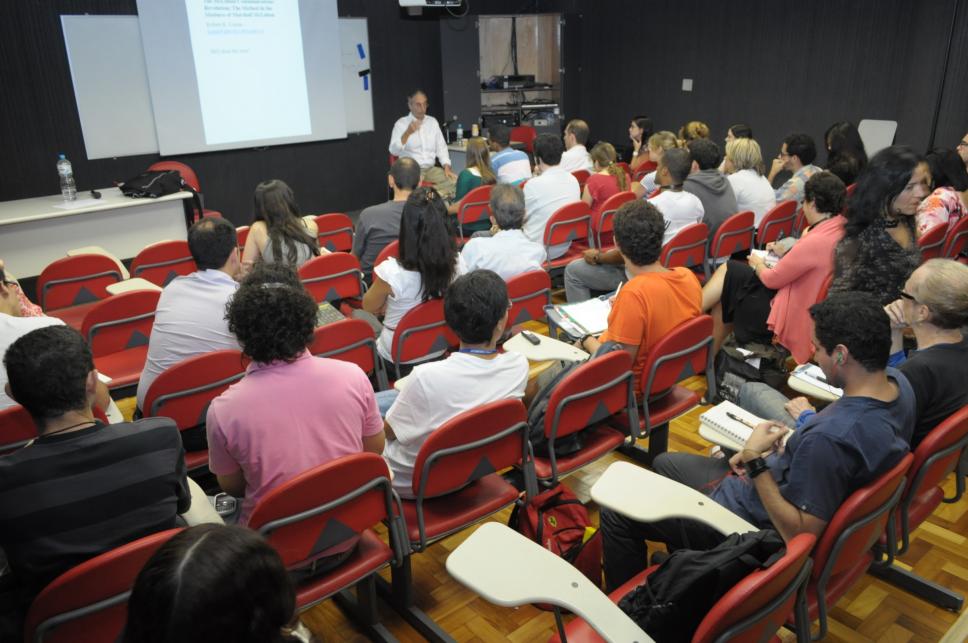 De pé, no canto direito da foto, profa. Adriana Andrade Braga (COM). Sentado de frente para plateia, prof. Robert Logan (Universidade de Toronto)