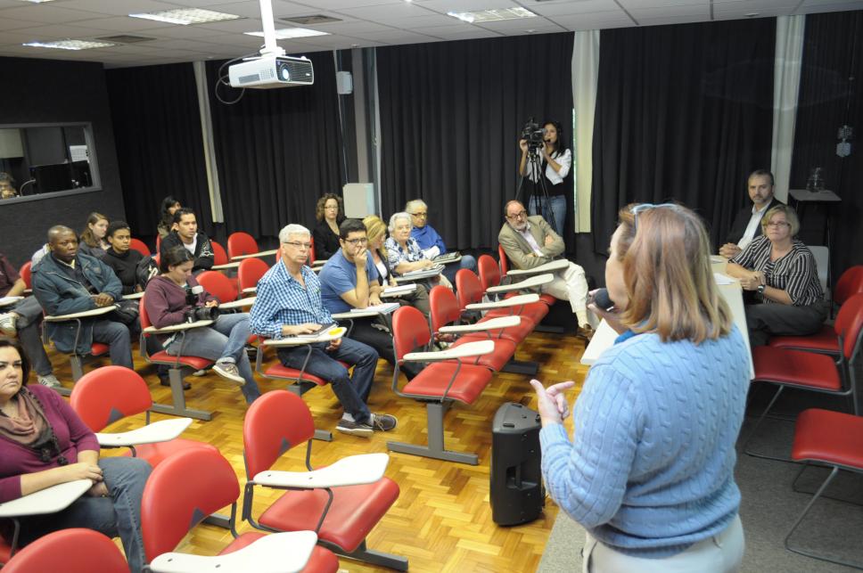 Palestrantes na mesa, da dir. para esq.: n.i., profa. Adriana Ribeiro Rice Geisler (JUR), profa. Denise Pini Rosalem da Fonseca (SER); 1º da primeira fila, da dir. para esq.: prof. Hilton Augusto Koch (EMPG, CCBS); 1ª da terceira fila, da dir. para esq.: Márcia Rinaldi de Mattos (IEAHu)