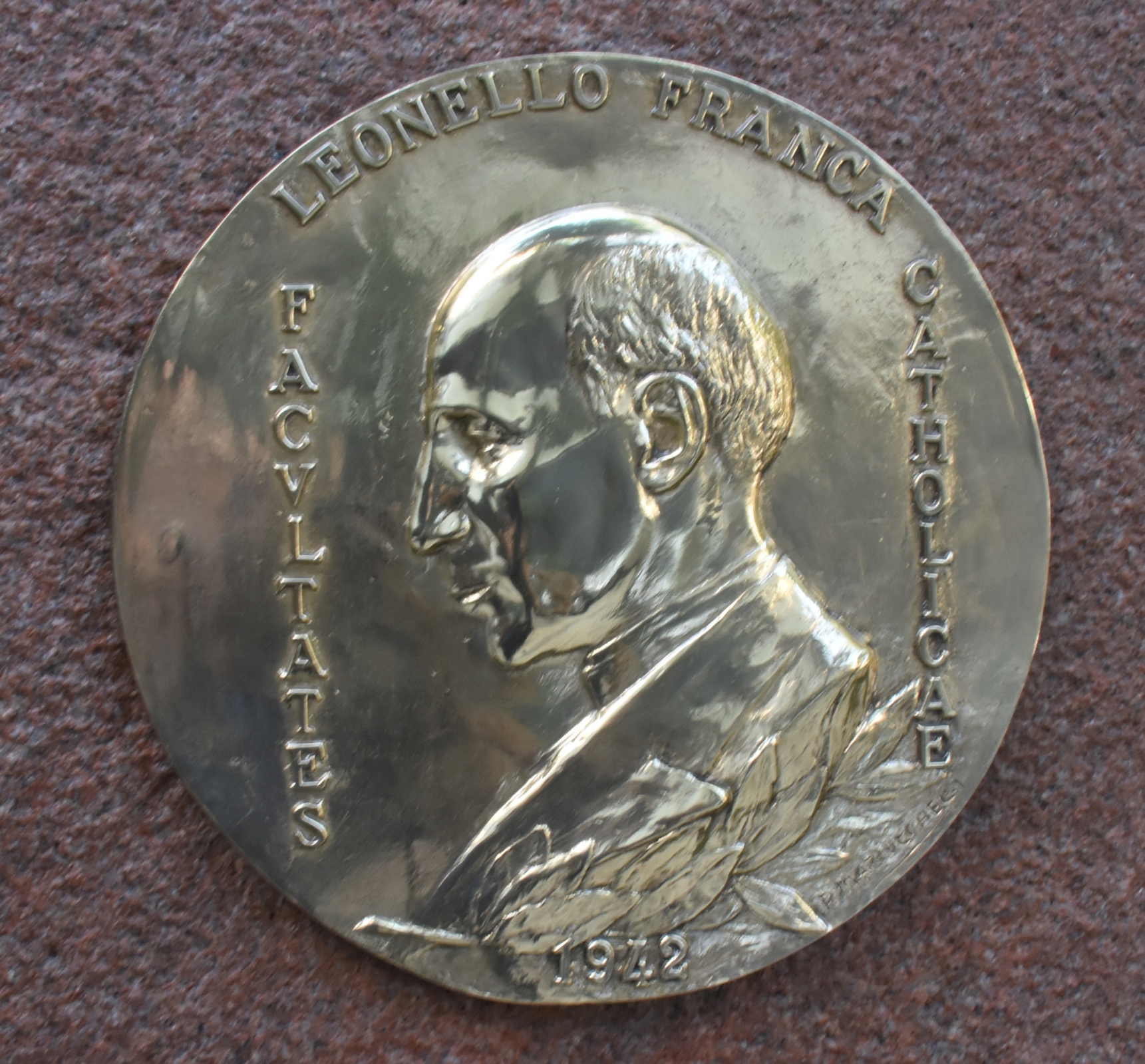 [Obs.: Quando da celebração dos 25 anos de falecimento do pe. Franca, o medalhão foi trazido para o campus da PUC-Rio, em 03/09/1973 e colocado em uma base de granito no bosque. Em 2023, o medalhão foi relocado para a entrada do prédio da Fundação Padre Leonel Franca, em 05/05/2023. Posteriormente, foi inaugurado um busto do pe. Franca em local de grande movimentação próximo à entrada principal do campus.]