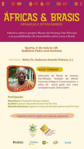 Será realizado na próxima quarta-feira, 17/5, às 10h, no Auditório Padre Anchieta. Na ocasião, a PUC-Rio receberá a visita de Kojo Yankah para uma conferência sobre o projeto do Museu da Herança Pan-Africana e sobre as possibilidades de intercâmbio entre Gana e Brasil. Kojo Yankah foi ministro de Estado e membro do Parlamento em Gana. Foi também editor do Daily Graphic, o jornal de maior circulação no país, e fundador do African University College of Communications (AUCC) em 2002.