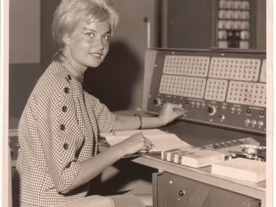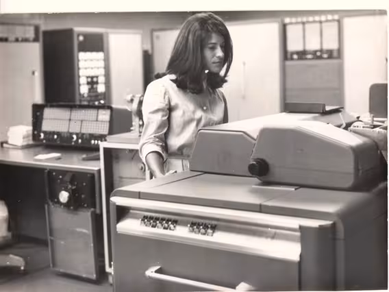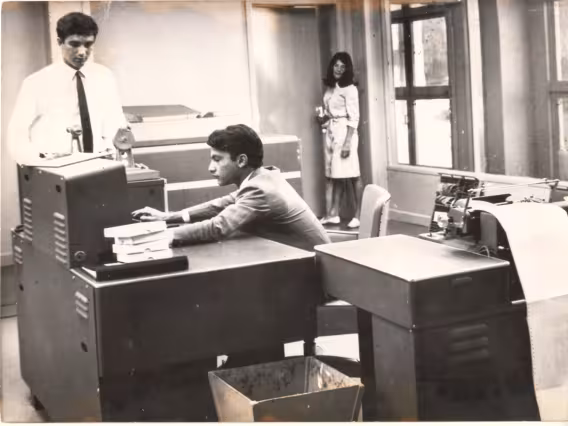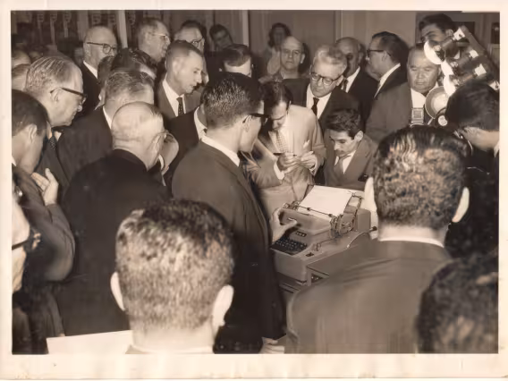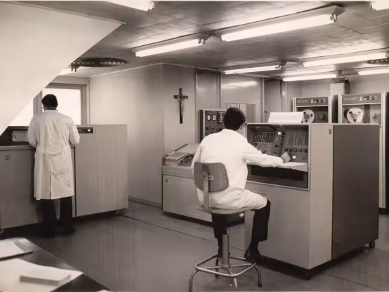 O ministro Roberto Campos e Sr. Georg Herz na inauguração do Computador IBM 1130.