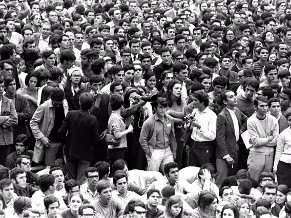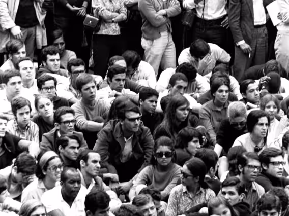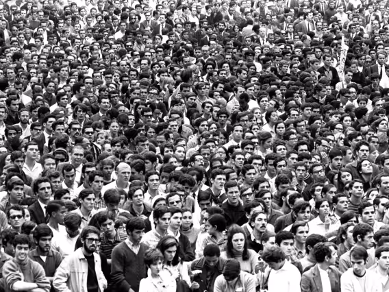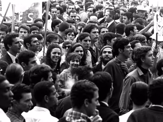 A multidão de rostos na Passeata dos Cem Mil, na Cinelândia. Na parte inferior, quase ao centro, Ana Waleska, à época aluna de Pedagogia, aparece ao lado de Maria Cecília Londres, aluna de Letras.