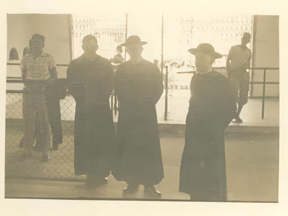 Dia do Reitor. Padres na entrada do ginásio esportivo no Colégio Santo Inácio.