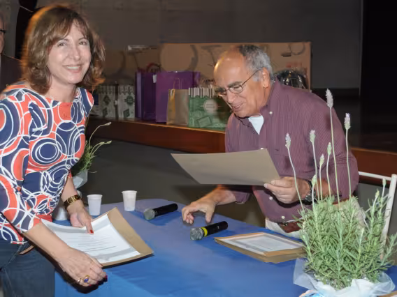Os funcionários Carlos Roberto e Antonio Carlos recebem os cumprimentos pela dedicação à PUC-Rio.