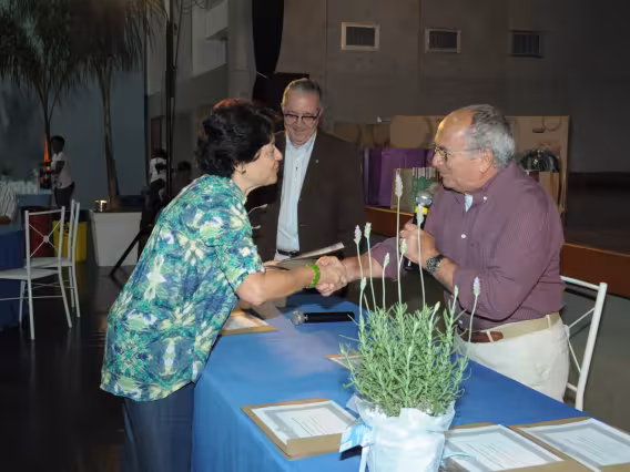 O professor Marcelo Jasmin recebe os cumprimentos do Vice-Reitor Comunitário, professor Augusto Sampaio.