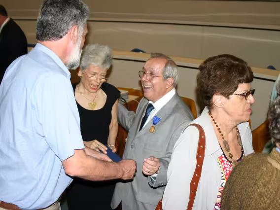 O Reitor Padre Josafá Carlos de Siqueira S.J. visita a exposição. Sala com as vitrines de cada Centro (CCBM, CCS, CTC e CTCH) da PUC-Rio, e mesa multitouch com exibição de imagens relacionadas aos Centros.
