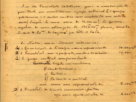 Rascunho manuscrito do Pe. Pedro Belisário Velloso S.J., de projetos/propostas para a construção do futuro campus da Universidade Católica.