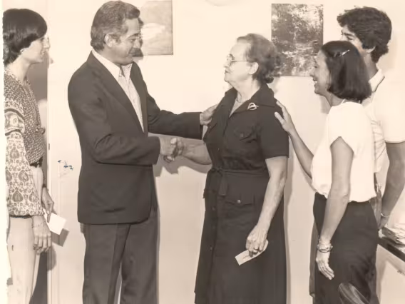 Código exclusivo jf0008_007 Coleção Acervo de Fotos do Projeto Comunicar - cont. Data de criação 01/01/1980 Natureza do documento imagem Tipo de documento fotografia PB Descrição O Vice-Reitor de Desenvolvimento cumprimentando Deotília Ormonde do Carmo, eleita funcionária-padrão da Universidade.