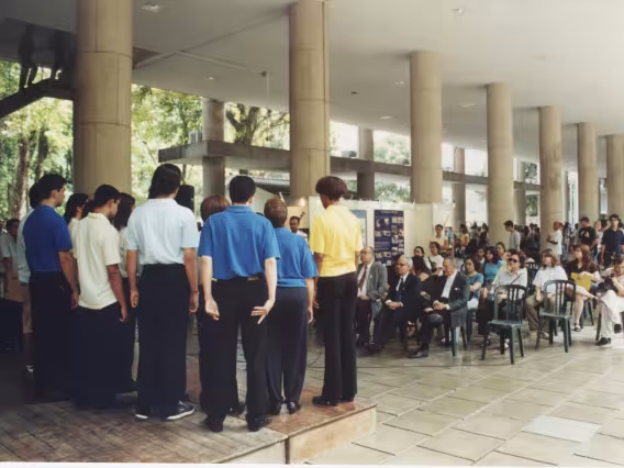 Autoridades da Pontifícia Universidade Católica do Rio de Janeiro reunidas em frente ao Solar Grandjean de Montigny.