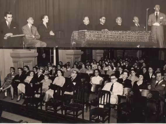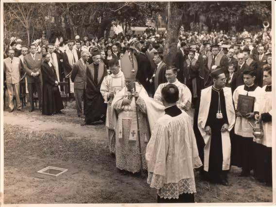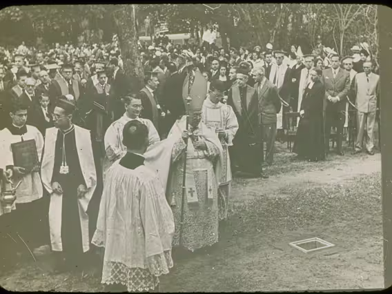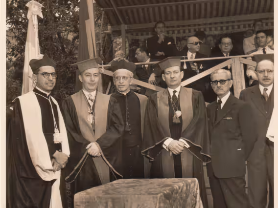 Padre Auguste Magne S.J., professores e alunos em frente ao Palacete Joppert, na Rua São Clemente, primeira sede das Faculdades Católicas.