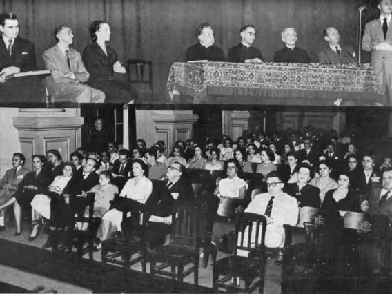 Almoço, talvez referente ao Dia do Reitor, nos pilotis do Edifício Cardeal Leme, na altura do bloco C, no qual há acima dos elevadores a placa comemorativa da inauguração do campus Gávea.