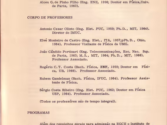 Seção referente à 'Física', que contém o nome do coordenador do programa, lista de professores e programas, no Catálogo oficial da Escola Graduada de Ciências e Engenharia (EGCE), 1968 - 1969.