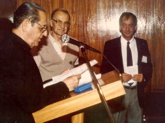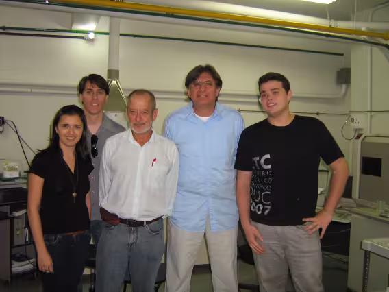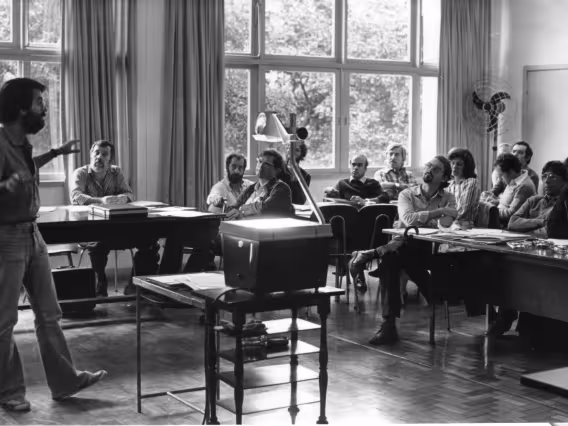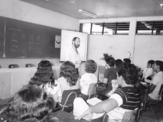 O professor Adilson Curtius e alunos em sala não identificada.