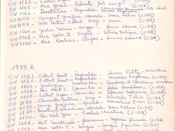 Lista manuscrita de monitores e bolsistas CIDA em 1989.