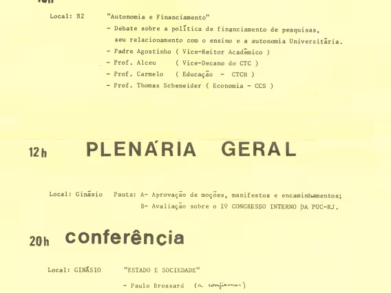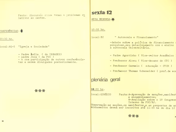 Páginas 18 e 19. Atividades de quinta e sexta-feira. Mesa-redonda Autonomia e financiamento, no auditório B2. Plenária geral, no Ginásio Esportivo.