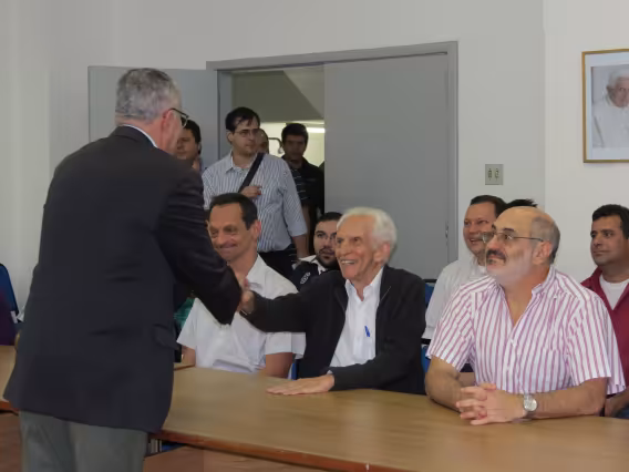 Pe. Josafá cumprimenta o prof. Antonio Luz Furtado, do Departamente de Informática.