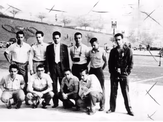 Grupo de estudantes e/ou professores, aparentemente num campus universitário fora do Brasil. Ao fundo, os arcos olímpicos.