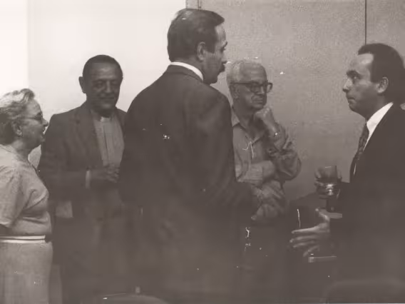 Professor Rinaldo Delamare, então Decano do Centro de Ciências Biológicas e de Medicina (CCBM), recebe o diploma de professor-fundador do reitor pe. Laércio S.J. A cerimônia homenageou professores que participaram da criação de cursos, unidades e órgãos na PUC-Rio. O prof. Rinaldo Delamare fundou o curso de Aperfeiçoamento Médico na Universidade em 1953.