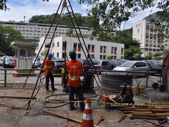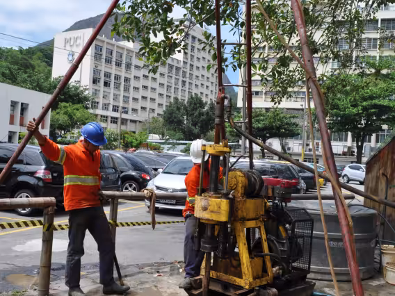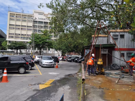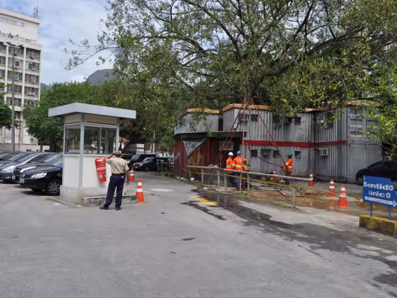 Carros no pátio do estacionamento principal da PUC-Rio. Ao fundo, a rua Marques de São Vicente e os prédios da Gávea.