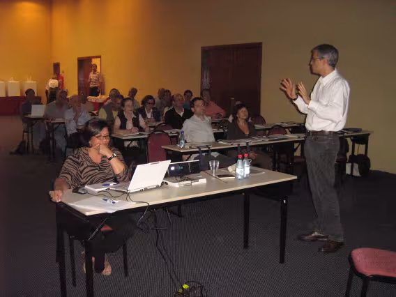 Mesa com representantes dos funcionários, com faixas ao fundo, por ocasião de uma assembleia de greve pelos funcionários da PUC-Rio. A greve chegou a ser decretada, mas negociações em dias posteriores levaram a um acordo e a greve foi cancelada.