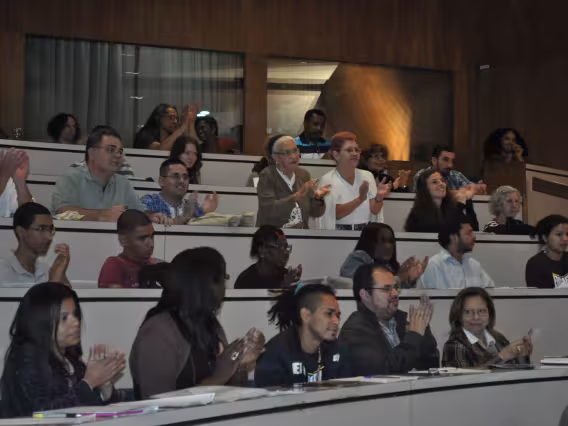 O auditório, composto por professores e alunos, aplaude a Mãe Beata Beatriz.
