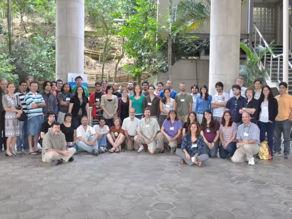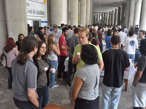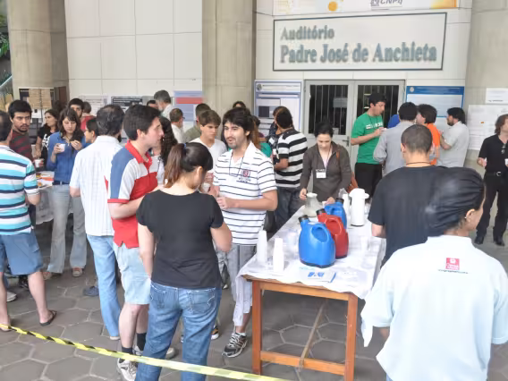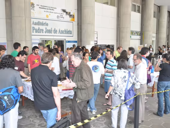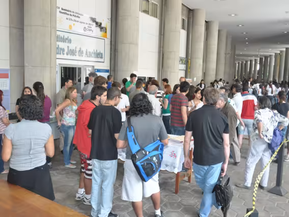 Do lado de fora do Auditório Anchieta, a plateia acompanha a abertura do evento.