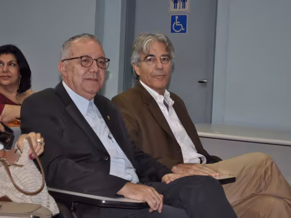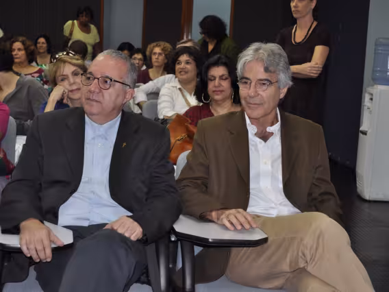 O vice-reitor da PUC-Rio, pe. Josafá e o vice-reitor para assuntos acadêmicos, prof. José Ricardo Bergmann, durante aula inaugural.